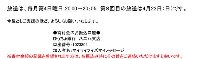「MY LIFE IS MY MESSAGE」の活動は、みなさまのご支援、ご協力により運営されています。個人、企業などを問わず、ご支援をお待ちしております。