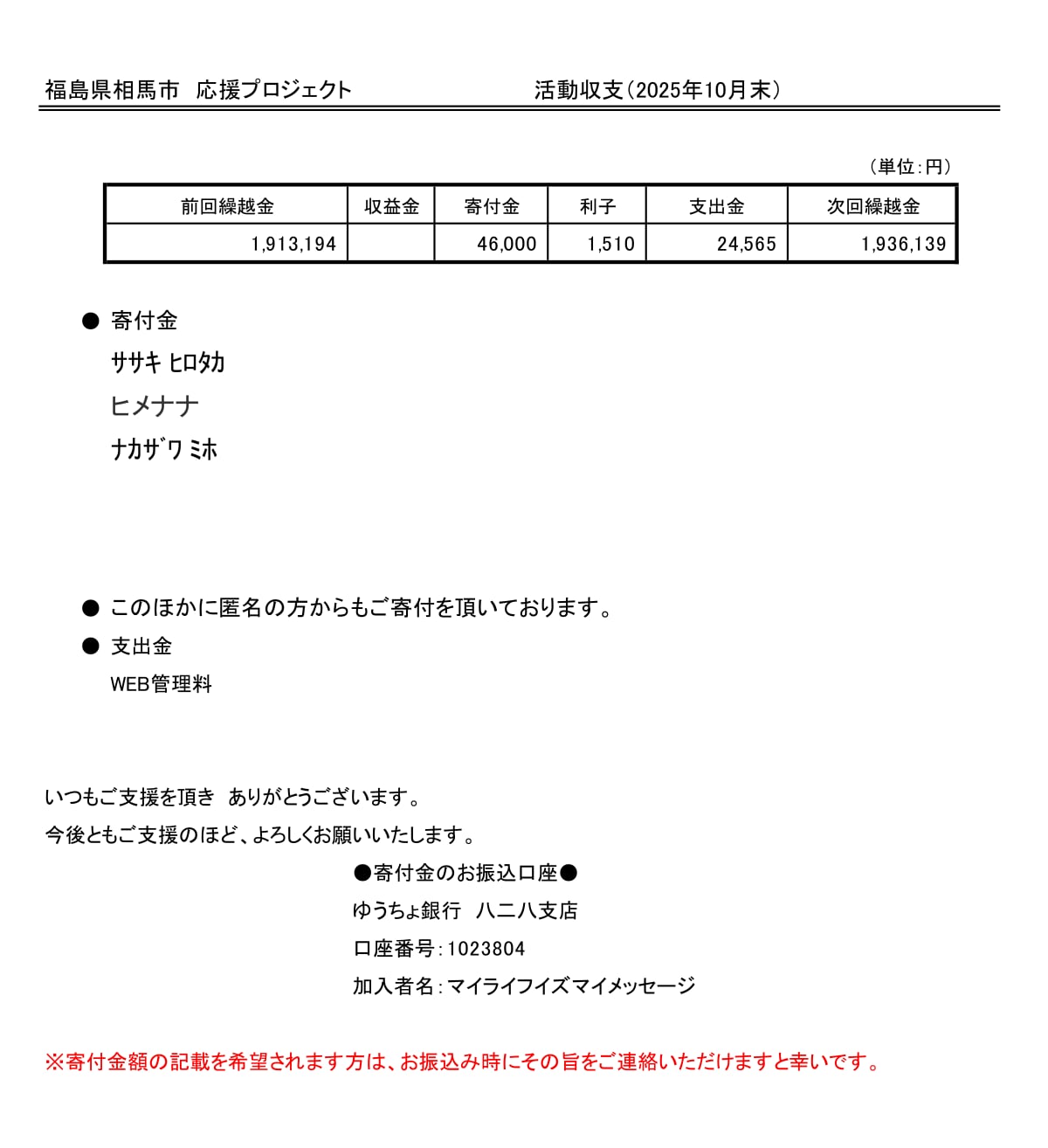 「MY LIFE IS MY MESSAGE」の活動は、みなさまのご支援、ご協力により運営されています。個人、企業などを問わず、ご支援をお待ちしております。